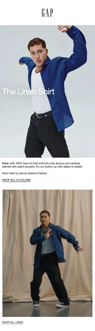 From day 1 we knew this campaign would need all the movement we could get. To push dance in a new an inventive way across our e-commerce site. With the juxtaposition of portraits that show expressive movement and texture of linen.